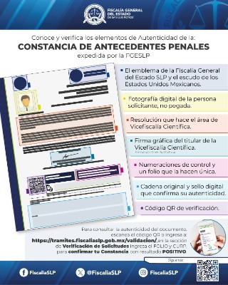 Además de que se deben verificar los elementos que dan autenticidad a la constancia de no antecedentes penales, como lo es el emblema de la FGESLP, fotografía del o la solicitante no pegada, resolución que hace la Vicefiscalía Científica, firma gráfica, números de folio, cadena original y sello digital.