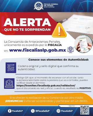 La Fiscalía General del Estado de San Luis Potosí (FGESLP) le recuerda a la ciudadanía potosina, que se brindan constancias de no antecedentes penales de manera segura, expedita y en línea a través de su página web oficial.