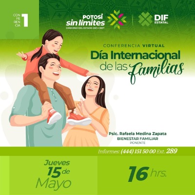 El Sistema Estatal para el Desarrollo Integral de la Familia (DIF) invita a las y los potosinos a participar en la conferencia virtual con motivo del Día Internacional de las Familias impartida por el equipo multidisciplinario del área de Bienestar Familiar.