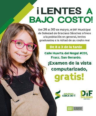 Manteniendo firmes las directrices del Alcalde Juan Manuel Navarro Muñiz de priorizar el bienestar de la población, el Sistema Municipal para el Desarrollo Integral de la Familia (DIF) de Soledad de Graciano Sánchez, ofrecerá, del 26 al 30 de mayo, lentes de graduación a bajo costo, una iniciativa que busca apoyar a las familias en el cuidado de su salud visual.
