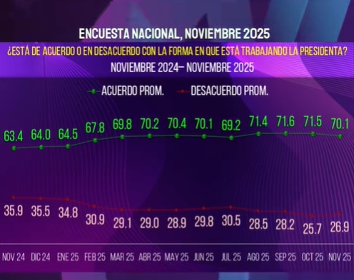 De acuerdo con el análisis, tras tres meses consecutivos con niveles de aprobación superiores al 71%, en noviembre la aprobación presidencial descendió casi dos puntos y cerró por debajo del 70%. El mayor retroceso se observó entre jóvenes de 18 a 25 años, quienes por primera vez en años se convirtieron en el grupo etario que menos aprueba a la presidenta.