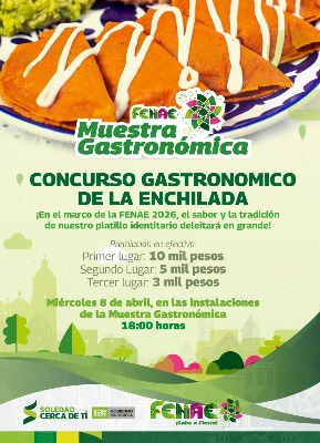 Con el objetivo de fortalecer la identidad culinaria y mantener cercanía con las familias locales y visitantes, el Ayuntamiento de Soledad de Graciano Sánchez invita al Concurso Gastronómico que se realizará el próximo miércoles 08 de abril a las 18:00 horas, en el marco de la Feria Nacional de la Enchilada (FENAE 2026); este certamen ofrecerá una bolsa total de 18 mil pesos en efectivo, destinada a reconocer el talento local en la cocina tradicional, con 10 mil pesos al primer lugar, 5 mil al segundo y 3 mil al tercero.