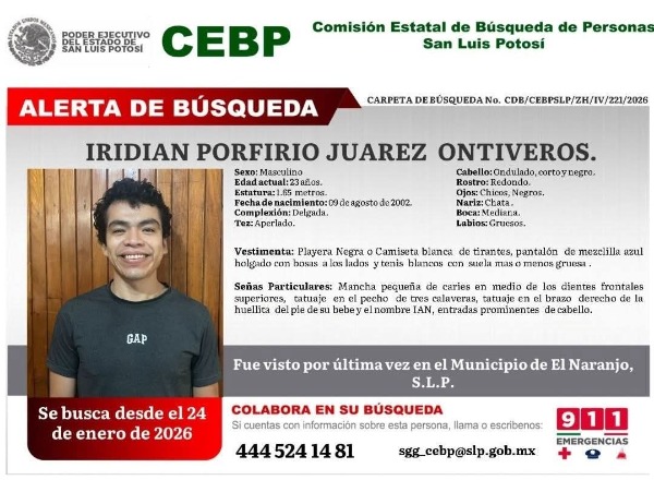 Se trata de Iridian Porfirio Juárez Ontiveros, de 23 años de edad, quien fue visto por última vez el 24 de enero en la cabecera municipal, cuando salió de casa, pero no regresó.
