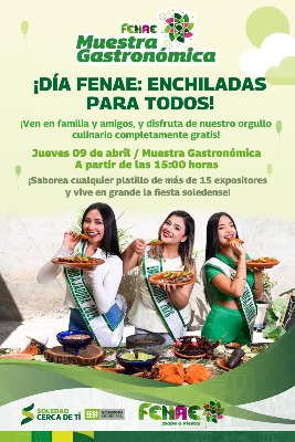 Este jueves 09 de abril, la Feria Nacional de la Enchilada celebrará el tan esperado "Día FENAE", una tradición muy especial en la que las y los visitantes podrán disfrutar del platillo identitario como son las enchiladas potosinas, completamente gratis, dentro de las instalaciones de la Muestra Gastronómica, donde podrán elegir la preparación de su preferencia y bebidas para todas las familias presentes.