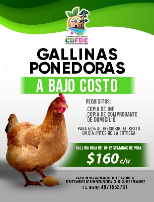 De acuerdo con la información oficial, las aves disponibles son gallinas rojas de entre 10 y 12 semanas de edad, con un costo de 160 pesos por unidad, lo que representa una opción viable para quienes desean iniciar un pequeño proyecto productivo.