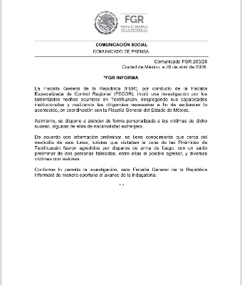 La Fiscalía General de la República (FGR), por conducto de la Fiscalía Especializada de Control Regional (FECOR), inició una investigación por los lamentables hechos ocurridos en Teotihuacán, desplegando sus capacidades institucionales y realizando las diligencias necesarias a fin de esclarecer lo acontecido, en coordinación con la Fiscalía General del Estado de México.
