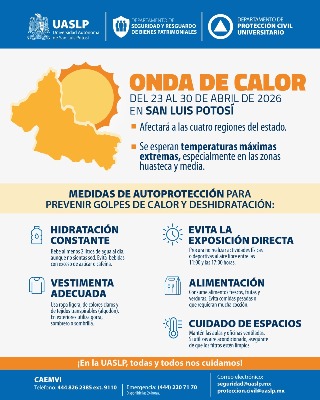 El Laboratorio Nacional de Variabilidad Climática, Teledetección y Evaluación de Riesgos (Variclim) y el área de Protección Civil Universitario de la Universidad Autónoma de San Luis Potosí (UASLP) advirtieron sobre la presencia de una onda de calor que impactará las cuatro regiones del estado, derivada de un sistema de alta presión. De acuerdo con el pronóstico, se esperan temperaturas máximas muy elevadas en los próximos días, con mayor intensidad en las zonas Huasteca y Media.