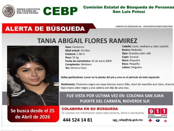 Autoridades emitieron la alerta de búsqueda y localización de una menor de edad, vista por última en la colonia San Juan del ejido Puente del Carmen, en el municipio de Rioverde el 26 de abril, solicitando el apoyo ciudadano para lograrlo.