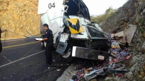 Esta mañana en el kilómetro 34 de la autopista a la altura de Tamasopo, un tráiler color blanco, con remolque tipo caja cargado con refrescos.