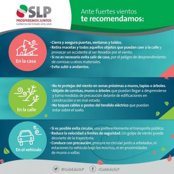Sobre el fenómeno de vientos fuertes, la dependencia pidió a la población tomen algunas medidas preventivas como asegurar puertas, ventanas y toldo, retirar objetos de terrazas, balcones y lugares altos de donde podrían caer, evitar subir a andamios, no protegerse de los vientos detrás de bardas o árboles, alejarse de cornisas, no acercarse a cables eléctricos que se hayan deprendido, reducir la velocidad al conducir en carretera y seguir las indicaciones en caso de que se les solicite evacuar algún lugar.