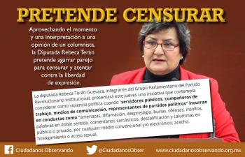Ahora es la Diputada también Priista Rebeca Terán que aprovechando una opinión del columnista Leonel Serrato, quiere dar un fuerte golpe a libertad de expresión y usando un pretexto llamado "violencia política" ha retomado la tentación de la censura y pretende ingresar mañana jueves 20 de abril del 2017 una iniciativa de ley que al igual que la hecha en su momento inicialmente por Martha Orta abre las puertas para atacar la libertad de expresión, ya que con el pretexto de considerar como violencia política cuando "servidores públicos, compañeros de trabajo, medios de comunicación, representantes de partidos políticos" incurran en conductas como "amenazas, difamación, desprestigio, burlas, ofensas, insultos, palabras en doble sentido, comentarios sarcásticos, descalificación y calumnias en público o privado, por cualquier medio convencional y/o electrónico; acecho, hostigamiento o acoso sexual deberán ser castigados.