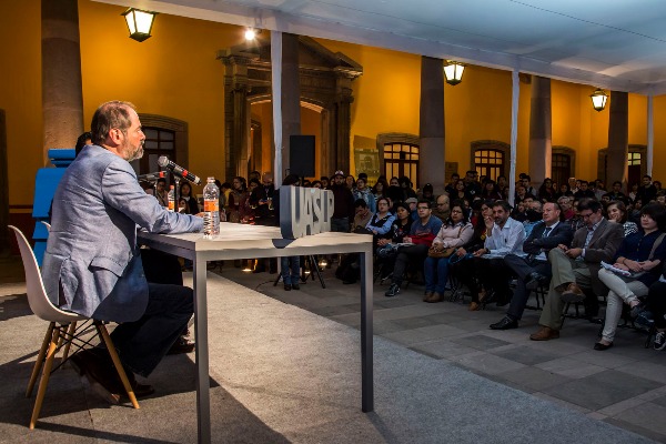 Con un Juan Villoro que aplaudió y reverenció al público que abarrotó el Patio de la Autonomía del Edifico Central de la UASLP en la edición 43 de la Feria Nacional del Libro, el autor mexicano habló de su más reciente libro: La Utilidad del Deseo.